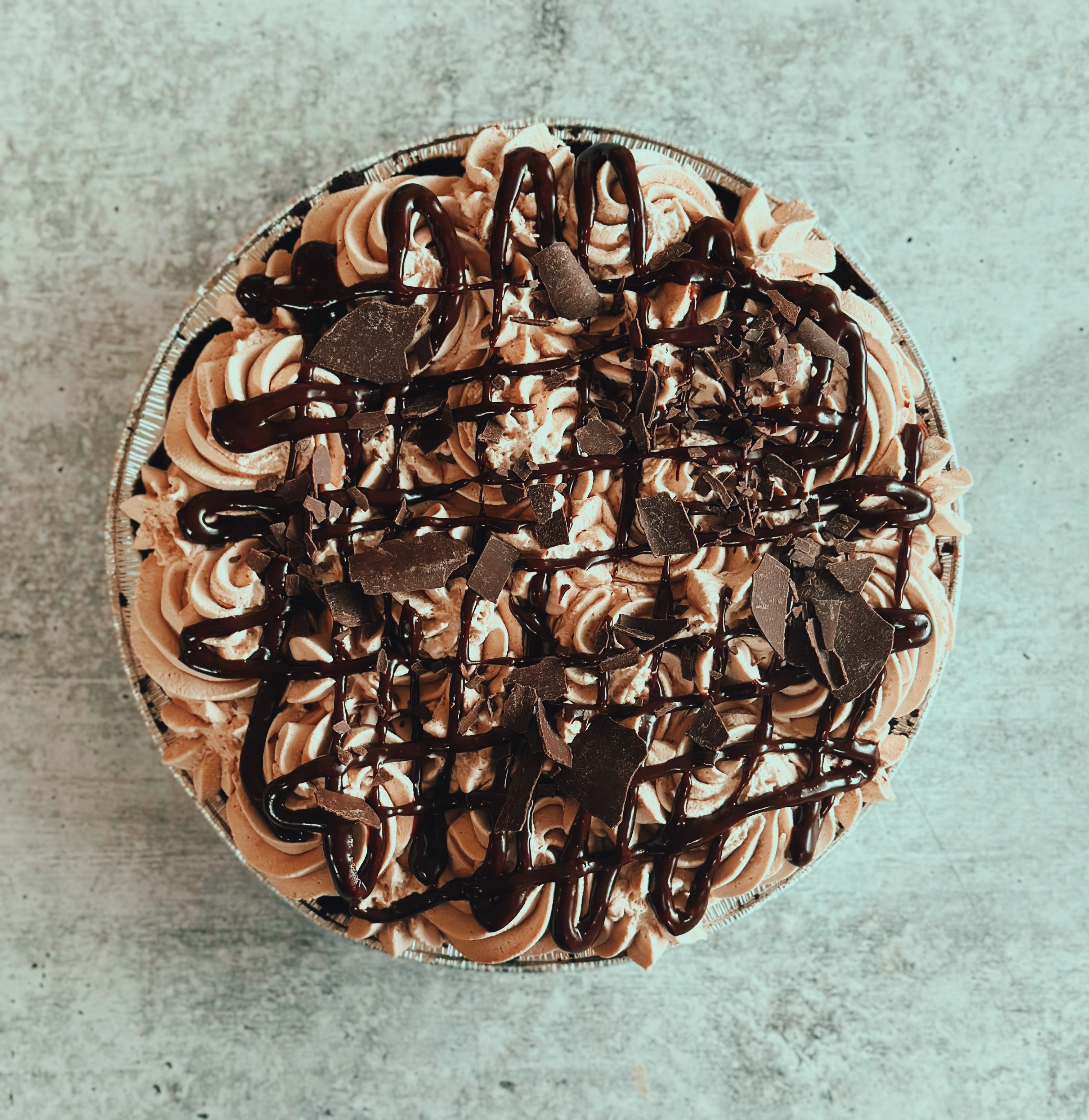 Decadent chocolate mousse and chocolate chantilly layered in an Oreo cookie crust. Topped with sea salt fudge and chocolate shavings. Served in a 9" pie tin.